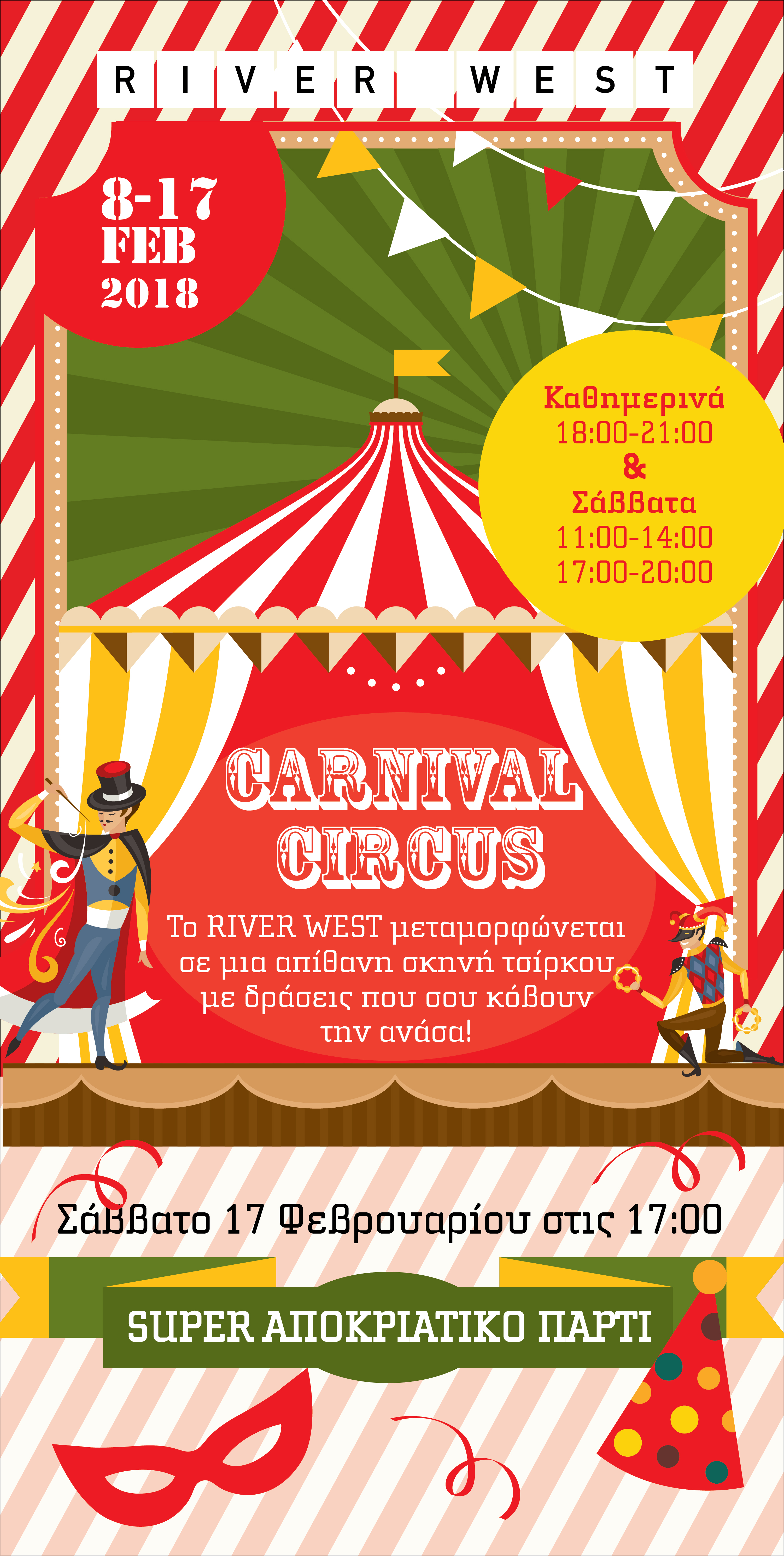 Το Σάββατο, 17 Φεβρουαρίου, οι ήρωες του τσίρκου φορούν τα καλά τους και υποδέχονται τους μικρούς μασκαράδες της αποκριάς σε ένα μεγάλο πάρτι. O DJ δίνει τον ρυθμό και το καρναβάλι ξεκινά. Απίθανα παιχνίδια, διαγωνισμοί, σκετσάκια, αλλά και πολύς χορός σε ένα πάρτι που θα κορυφωθεί με τη μεγάλη παρέλαση μασκαράδων σε όλους τους χώρους του RIVER WEST δημιουργώντας το μεγαλύτερο σαματά που έχει δει ποτέ το εμπορικό κέντρο.