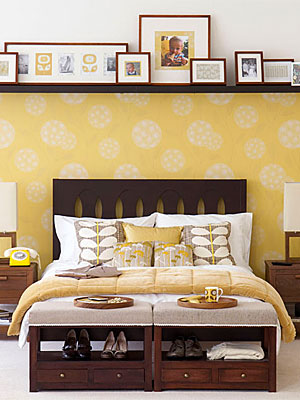 Φανταστείτε πόσο άχαρες θα έδειχναν όλες αυτές οι φωτογραφίες και οι κορνίζες στο ράφι πάνω από το κρεβάτι αν δεν υπήρχε αυτή η υπέροχη κίτρινη ταπετσαρία να «δέσει» το σύνολο.