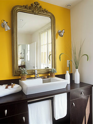 Οι μικροί χώροι προσφέρονται για πειραματισμό. Δείτε πώς το λιτό, μοντέρνο μπάνιο παίρνει ζωή με τον κίτρινο τοίχο.