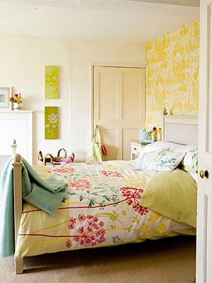 Τα σεντόνια και η ταπετσαρία με τις πολύχρωμες πικραλίδες, με έμφαση στο κίτρινο, δίνουν στο δωμάτιο ομοιομορφία και θετική ενέργεια.