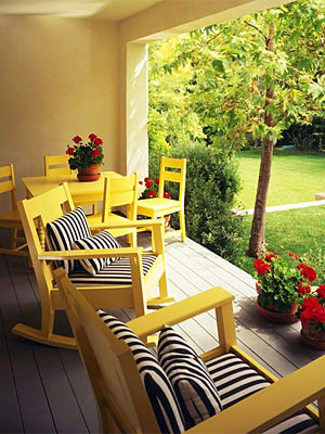 Δείτε πόσο όμορφα ταιριάζουν τα ασπρόμαυρα ριγέ μαξιλάρια με τα κατακίτρινα έπιπλα του κήπου.