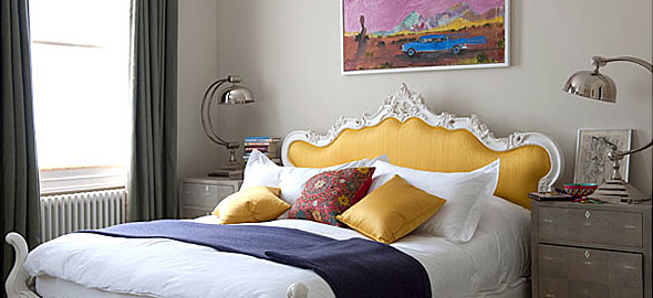 Το μουσταρδί-κίτρινο κεφαλάρι και τα κίτρινα μαξιλαράκια στο κρεβάτι «ζωντανεύουν» το μπαρόκ κρεβάτι και δημιουργούν χαρούμενη διάθεση στο νωχελικό γκρι δωμάτιο.