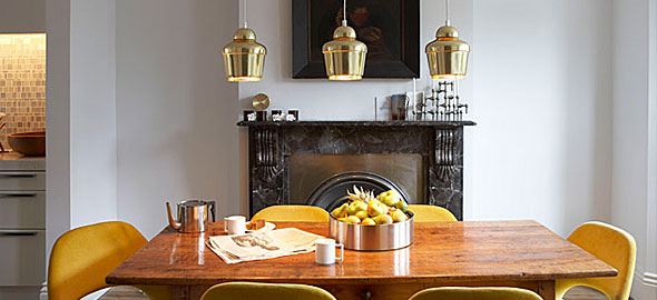 Τα μπρούτζινα κρεμαστά φωτιστικά και οι κίτρινες καρέκλες κάνουν μία κατά τα άλλα απλή τραπεζαρία να δείχνει τρομερά κομψή.
