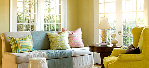 Το πολύ φιλόξενο αυτό δωμάτιο συνδυάζει αυστηρά στοιχεία, όπως η μουσταρδί μπεζέρα και το μασίφ τραπεζάκι, με πιο ανέμελα, όπως ο καναπές με τα πολύχρωμα καλύμματα και τα τεράστια μαξιλάρια, και έτσι ο χώρος γίνεται χαρούμενος χάρη στο απαλό κίτρινο στους τοίχους.