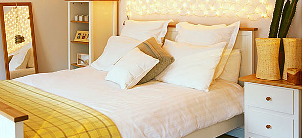 Ένα πολύ λιτό δωμάτιο παίρνει αμέσως χαρά και λάμψη με τα νεραϊδοφωτάκια στον τοίχο, πάνω από το κρεβάτι, και ένα κίτρινο ριχτάρι.