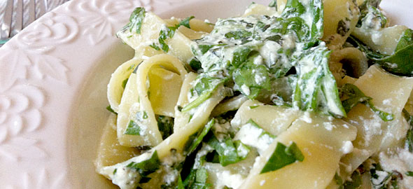 Βράστε τα ζυμαρικά σύμφωνα με τις οδηγίες της συσκευασίας. Παράλληλα ζεστάνετε το ελαιόλαδο σε μεγάλη κατσαρόλα, σε μέτρια φωτιά. Βάλτε μέσα το σπανάκι και μαγειρέψτε το, ανακατεύοντας με τσιμπίδα, μέχρι να μαλακώσει λίγο, για 2 λεπτά.