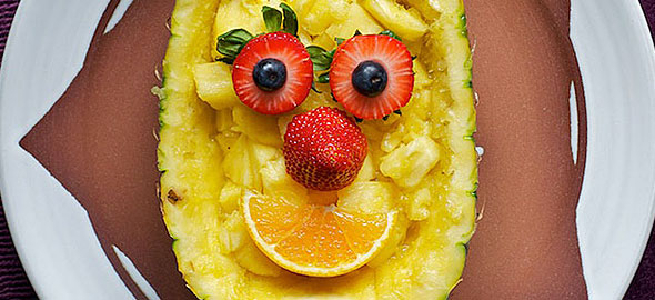 Το μόνο που θα χρειαστεί να κάνετε είναι να κόψετε έναν ανανά στη μέση, όπως στη φωτογραφία, να «σκάψετε» και να ψιλοκόψετε το εσωτερικό του και να διακοσμήσετε με άλλα φρούτα, ώστε να προκύψει μία χαρούμενη φατσούλα.