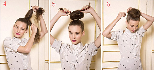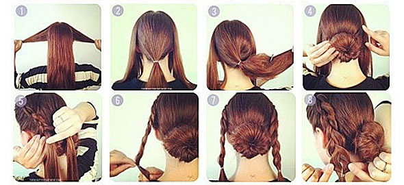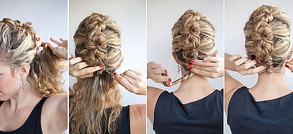 Θα την χωρίσετε στη μέση, θα δέσετε τα δύο μέρη της σα να δένατε κόμπο και θα τυλίξετε τις άκρες των μαλλιών γύρω από τη βάση, στερεώνοντάς τα με τσιμπιδάκια.