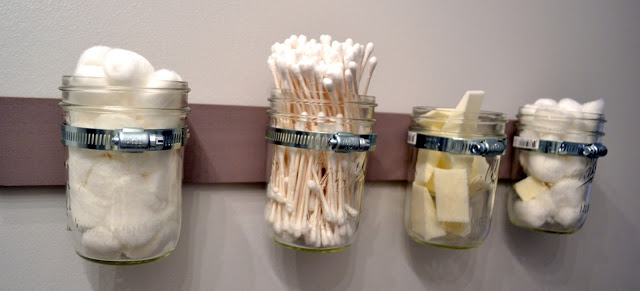 Βάφετε μια σανίδα στα χρώματα του μπάνιου ή την αγοράζετε έτοιμη. Καρφώνετε τα κρεμαστράκια στο ξύλο (ή ο σύζυγός σας), περνάτε τους μεταλλικούς σφιγκτήρες στα βαζάκια και τα κρεμάτε.