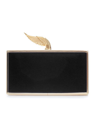 Τσαντάκι-πορτοφολάκι, με λεπτό χρυσαφί αλυσιδάκι και σχέδιο με φτερό στο κούμπωμα.