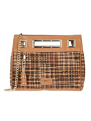 Τσάντα χειρός από δερματίνη και μπουκλέ ύφασμα, σε τουίντ σχέδιο, με μαγνητικό κούμπωμα.