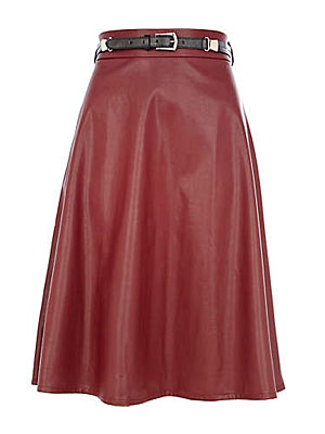 Φούστα μέχρι το γόνατο με υφή δερματίνης και μαύρο δερμάτινο ζωνάκι στη μέση. Συνδυάστε τη με μαύρο λεπτό πουλοβεράκι και μποτάκια.