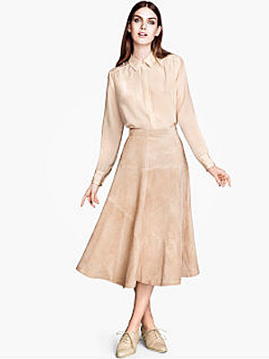 To σουέντ είναι από τις αγαπημένες υφές του φθινοπώρου και δίνει όγκο και βαρύτητα στη φούστα αυτή, η οποία μπορεί να φορεθεί τα πρωινά με φλατ παπούτσια.