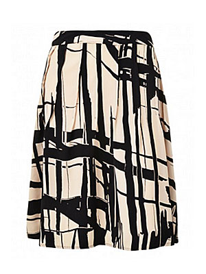 Φούστα μέχρι το γόνατο, με ελαφρύ πλισέ σχέδιο, σε λευκό και μαύρο χρώμα. Συνδυάστε τη με ένα στενό τοπ σε έντονο χρώμα (π.χ. κόκκινο ή σμαραγδί) και μποτάκια.