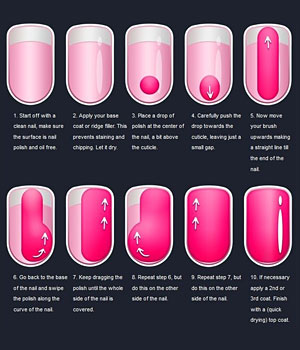 Τώρα μπορείτε να ξεκινήσετε να βάφετε τα νύχια σας. Ακολουθήστε το παρακάτω διάγραμμα για να βάψετε τα νύχια σας με την ακριβή τεχνική που ακολουθούν οι επαγγελματίες.
