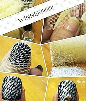 Για να κάνετε το σχέδιο «δίχτυ» στο νύχι σας, αφού περάσετε το βασικό μανό, καλύψτε το νύχι με ένα κανονικό, λεπτό διχτάκι και περάστε ακριβώς από πάνω είτε κάποιο άλλο, πιο έντονο μανό είτε π.χ. χρυσόσκονη, όπως στη φωτογραφία.