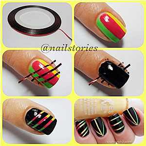 Χρησιμοποιώντας πάρα πολύ λεπτές αυτοκόλλητες ταινίες, μπορείτε να κάνετε εντυπωσιακά σχέδια με ρίγες στα νύχια σας, όπως τα παρακάτω: