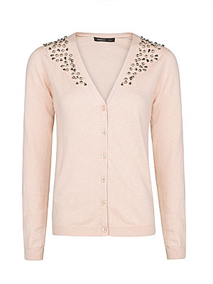 Λεπτή ζακετούλα σε παλ ροζ χρώμα, με λαμπερές πέτρες στους ώμους, από βισκόζη και πολυεστέρα.