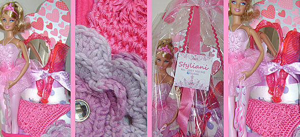 Το Diaper Cake είναι το ιδανικό δώρο για το νεογέννητο κοριτσάκι. Είναι διώροφο και περιέχει ένα πλεκτό χειροποίητο σκουφάκι, μία κορδελίτσα για τα μαλλιά, ένα σετ καθρέφτη, χτενούλα, μία Barbie original και πάνες.