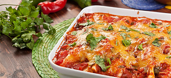 Μοιράζετε τη γέμιση σε 10 τορτίγιες και τις τυλίγετε ρολό. Βάζετε λίγη σάλτσα στο πυρέξ, να καλύψει τον πάτο, και τοποθετείτε τις γεμιστές τορτίγιες. Τις σκεπάζετε με την υπόλοιπη σάλτσα και τα τριμμένα τυριά.