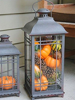 Αν έχετε έτσι κι αλλιώς στη βεράντα σας φανάρια από την καλοκαιρινή σας διακόσμηση, μπορείτε να τα γεμίσετε με μικρές κολοκύθες και διάφορα άλλα εποχιακά στοιχεία της φύσης.