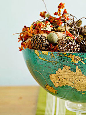 Με μία πρωινή βόλτα στο πάρκο μπορείτε εύκολα να μαζέψετε ξέρα κλαδιά, βελανίδια και κουκουνάρια, τα οποία θα τοποθετήσετε σε μισή υδρόγειο σφαίρα (αυτή που είχατε ως μαθητές;), με μία γυάλινη βάση από κάτω. Κάπως έτσι έχετε το τέλειο κεντρικό κομμάτι για το τραπέζι σας.