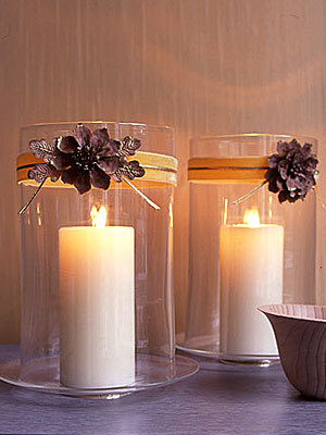 Μπορείτε να στολίσετε τα απλά γυάλινα βάζα σας με φθινοπωρινά στοιχεία (π.χ. μία κορδέλα και αποξηραμένα φύλλα) και να τοποθετήσετε μέσα ένα μεγάλο εκρού κερί.