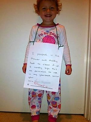 (Έκανα κακά μου στο ντους και ο μπαμπάς έπρεπε να τα καθαρίσει. Γι’αυτό υπογράφω ότι θα χρησιμοποιήσω το παρόν ως φωτογραφία μου στο ετήσιο σχολικό λεύκωμα της Γ΄ Λυκείου).