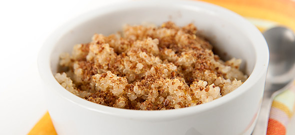 Πρωινό με κινόα: 1 φλιτζάνι μαγειρεμένο κινόα (ετοιμάστε το από την προηγουμένη), ¾ φλιτζανιού γάλα 0-1.5% λιπαρά ή αμυγδάλου, 1-2 φρούτα εποχής κομμένα ή/και αποξηραμένα cranberries, αλεσμένο λιναρόσπορο ή άλλο σπόρο. Συνδυάστε το μαγειρεμένο κινόα με το γάλα σε μικρή κατσαρόλα και μαγειρέψτε σε μέτρια φωτιά μέχρι να γίνει χυλός (όπως φτιάχνεται και η κρέμα βρώμης). Προς το τέλος του μαγειρέματος προσθέστε το/α φρούτο/α. Σερβίρετε σ' ένα μπολ και βάλτε 1 κουταλιά της σούπας αλεσμένο λιναρόσπορο ή κάποιο άλλο σπόρο (π.χ. κολοκυθόσπορους), 1 κουταλάκι του γλυκού μέλι και λίγη κανέλα.