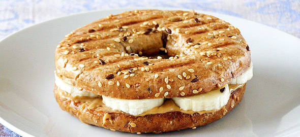 Γεύμα: Πάρτε δύο φρέσκα bagel από τον φούρνο, κόψτε τα στη μέση και απλώστε μπόλικο φυστικοβούτυρο. Κόψτε ένα αχλάδι ή μία μπανάνα σε λεπτές φέτες και απλώστε τις και αυτές μέσα στα bagel!