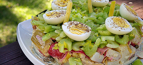 Βράζετε τις πατάτες, τις ξεφλουδίζετε, τις τρίβετε σε χοντρό τριφτή, προσθέτετε το ψιλοκομμένο φρέσκο κρεμμυδάκι, το λεμόνι, το λάδι και το αλατοπίπερο. Το αφήνετε να κρυώνει.