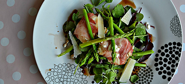 Πράσινη σαλάτα µε σπαράγγια και τραγανό προσούτο