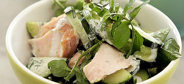 Ανακατεύετε 1 ματσάκι ρόκα με 200 γρ. βρασμένα παντζάρια σε κυβάκια, 1 πέστροφα καπνιστή σε κομματάκια και άνηθο ψιλοκομμένο. Ανακατεύετε και τη sauce, που θα προσθέσετε την τελευταία στιγμή: 1/4 φλιτζανιού ελαιόλαδο, 1 κουτ. γλυκού μουστάρδα, 2 κουτ. σούπας λεμόνι και αλατοπίπερο. Συνοδεύετε με 1 φέτα μαύρο ψωμί (κατλα προτίμηση πολύσπορο).