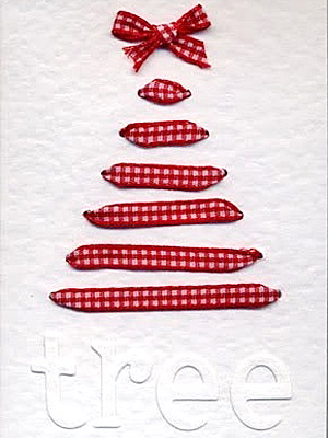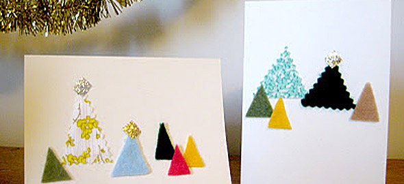 Αν έχετε περισσευούμενα κομμάτια από ύφασμα ή τσόχα μπορείτε να τα κόψετε σε σχήμα χριστουγεννιάτικου δέντρου, με τη βοήθεια ενός ψαλιδιού χειροτεχνίας με «δοντάκια», και να τα κολλήσετε σε μονόχρωμες κάρτες. Μάλιστα, στην κορυφή τους μπορείτε να κολλήσετε όμορφα λαμπερά αυτοκόλλητα.