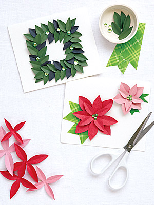 Για την κάρτα αυτή θα χρειαστεί λίγο περισσότερος χρόνος και πολλά φύλλα χαρτιού χειροτεχνίας. Το πρώτο πράγμα που θα χρειαστεί να κάνετε είναι να σχεδιάσετε με ένα μολύβι τα φύλλα (σε πράσινο χαρτί χειροτεχνίας), τα οποία στη συνέχεια θα κόψετε με ένα ψαλίδι (για το σχέδιο με το στεφάνι θα χρειαστείτε περίπου 50 φύλλα). Για το σχέδιο με τα αλεξανδρινά λουλούδια, διπλώστε ένα κόκκινο τετράγωνο χαρτί χειροτεχνίας στη μέση και ξανά στη μέση. Με ένα μολύβι σχεδιάστε το λουλούδι: Η βάση του λουλουδιού θα πρέπει να είναι κατά μήκος των διπλωμένων γονιών του χαρτιού. Με το ψαλίδι κόψτε το πέταλο, αλλά όχι τη διπλωμένη γωνία και ανοίξτε το για να πάρει σχήμα λουλουδιού. Κάντε το ίδιο μερικές ακόμα φορές για να έχει το λουλούδι σας «στρώσεις».