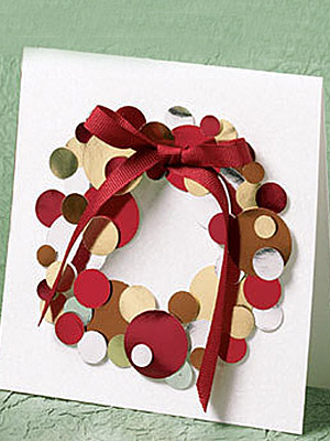 Αν έχετε τρυπητήρια για χειροτεχνίες κάντε τρύπες, σε διάφορα μεγέθη, σε πολύχρωμα χαρτιά και κολλήστε τα στρογγυλά κομματάκια σε μία λευκή κάρτα έτσι ώστε να σχηματίζουν ένα γιορτινό στεφάνι! Για να γίνει, μάλιστα, το στεφάνι σας ολοστρόγγυλο μπορείτε πρώτα να το σχεδιάσετε με έναν διαβήτη. Κολλήστε στο πάνω μέρος του στεφανιού και μία κορδέλα με φιόγκο και η πανέμορφη κάρτα σας είναι έτοιμη!