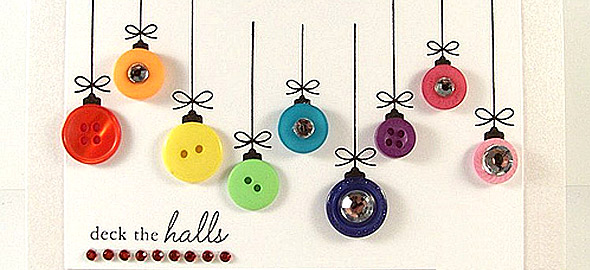 Απίστευτα απλή και εντυπωσιακή κάρτα, για την οποία θα χρειαστεί να σχεδιάσετε με ένα μαύρο μαρκαδοράκι τα «σχοινιά» από τα οποία θα κρέμονται οι «μπάλες»-κουμπιά. Στη συνέχεια, θα επιλέξετε μερικά όμορφα, πολύχρωμα κουμπιά και θα τα κολλήσετε στο τέλος του κάθε σχοινιού.