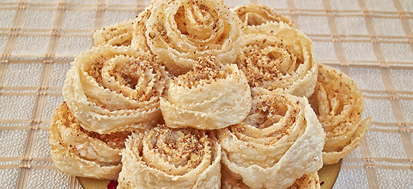 Συνεχίζετε με φύλλο-γέμιση έως ότου τελειώσουν. Φροντίζετε πάνω-πάνω να κρατήσετε 3 φύλλα κρούστας χωρίς γέμιση. Κόβετε το γλυκό σε κομμάτια και σε κάθε κομμάτι καρφώνετε ένα γαρύφαλλο.