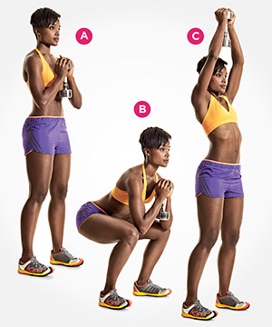 Κρατήστε ένα βαράκι από τη μία μόνο πλευρά του κάθετα μπροστά στο στήθος σας, με τα δυο σας χέρια (Α). Πιέστε τα ισχία σας προς τα πίσω και χαμηλώστε το σώμα σε θέση squat, μέχρι το πάνω μέρος των μηρών σας να είναι παράλληλο με το πάτωμα. Οι αγκώνες σας πρέπει να βρίσκονται ανάμεσα στα γόνατά σας (Β). Μείνετε και πιέστε ξανά το σώμα σας προς τα πάνω για να σηκωθείτε, σηκώνοντας ταυτόχρονα και το βαράκι πάνω από το κεφάλι σας (C). Χαμηλώστε το βαράκι μπροστά στο στήθος και ελάτε ξανά στην αρχική σας θέση.