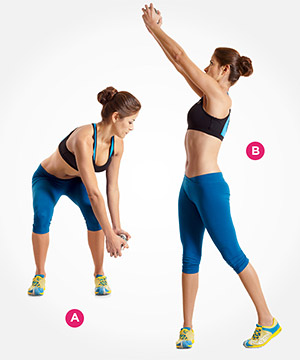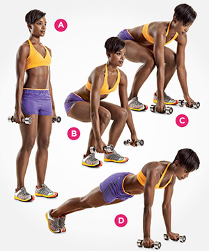 Σταθείτε με τα πόδια σας ανοιχτά, στο άνοιγμα των ώμων, και τα χέρια ίσια στα πλευρά, κρατώντας ένα ζευγάρι βαράκια (Α). Σπρώξτε τους γλουτούς σας προς τα πίσω και χαμηλώστε το σώμα σας όσο πιο βαθιά μπορείτε σε θέση squat, σα να ετοιμάζεστε να καθίσετε σε μία καρέκλα (Β). Τοποθετήστε τα βαράκια στο πάτωμα (C) και τεντώστε τα πόδια σας προς τα πίσω, παίρνοντας θέση pushup. Στη συνέχεια ελάτε ξανά σε θέση squat. Σηκωθείτε και πηδήξτε. Αυτή είναι μία επανάληψη.