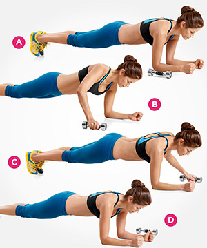 Τοποθετήστε ένα ζευγάρι βαράκια στο πάτωμα, σε απόσταση όση το άνοιγμα των ώμων σας. Στηριχτείτε στα βαράκια και ελάτε σε θέση push-up (Α). Χαμηλώστε το σώμα σας, παράλληλα με το πάτωμα, και στη συνέχεια πιέστε προς τα πίσω (Β). Ενώ είστε στον αέρα, σηκώστε το δεξί σας χέρι, με το βαράκι, παράλληλα με το στήθος σας. Μείνετε, επαναφέρετε το βαράκι στο πάτωμα και επαναλάβετε με το αριστερό χέρι (C). Αυτή είναι μία επανάληψη. Προσπαθήστε να μην στρίβετε τον κορμό σας κάθε φορά που σηκώνετε το χέρι με το βαράκι (για να το πετύχετε να έχετε πάντα καλά ρουφηγμένη την κοιλιά σας).