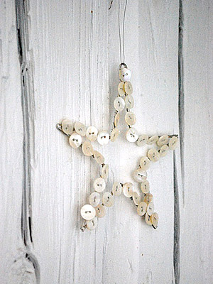 Για το στολίδι αυτό θα χρειαστείτε απλά λίγο σύρμα, με το οποίο θα σχηματίσετε ένα σχέδιο-αστεράκι, και μερικά λευκά κουμπιά για να το ντύσετε. Χρησιμοποιήστε κόλα σιλικόνης για να κολλήσουν πιο εύκολα!
