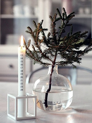 Ένα κλαδί από έλατο σε ένα βάζο με νερό και ένα λευκό κερί-ημερολογίο Χριστουγέννων. Η απλότητα σε όλο της το μεγαλείο!