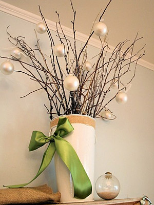 Βάλτε σε ένα απλό βάζο μερικά κλαδιά που θα βρείτε σε ένα κοντινό πάρκο, δέστε γύρω του μία όμορφη κορδέλα και κρεμάστε από τα κλαδιά μερικές μπαλίτσες! Τι πιο όμορφο και απλό;