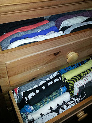 Διπλώστε τα ρούχα σας και τοποθετήστε τα κάθετα στο συρτάρι, ώστε και χώρο να κερδίσετε και να τα επιλέγετε πιο εύκολα (όταν τοποθετούνται οριζόντια, το ένα πάνω στο άλλο, συνήθως δεν βλέπουμε ποτέ τα κάτω-κάτω ρούχα).