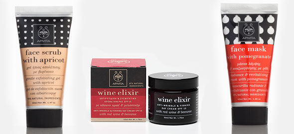 Σετ ομορφιάς αποτελούμενο από τα προϊόντα Wine Elixir Αντιρυτιδική και Συσφιγκτική Κρέμα Ημέρας SPF 15, Gel Ήπιας Απολέπισης με Βερίκοκο, Μάσκα Λάμψης & Αναζωογόνησης με Ρόδι (συνολική αξία ανά σετ: 55,90 ευρώ).