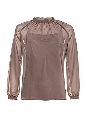 Μακρυμάνικο διαφανές πουκάμισο με εσωτερικό τοπ, σε σοκολατί χρώμα, με μικρό άνοιγμα στην πλάτη. Συνδυάστε το με ψηλόμεση δερμάτινη φούστα, για τις πιο business εμφανίσεις σας.