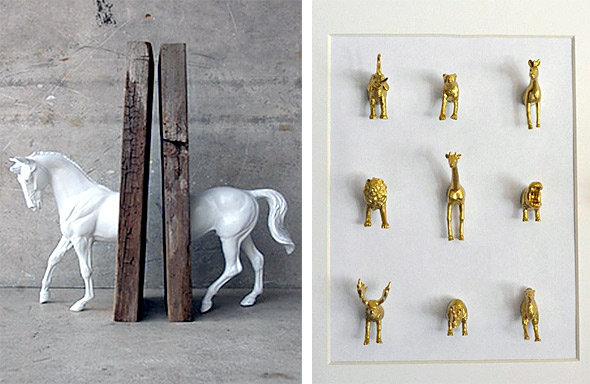 Το ίδιο μπορείτε να κάνετε με την πλαστική συλλογή του ζωικού βασιλείου. Τα ζωάκια αυτά είναι εύκολο να κοπούν με κάποιο πριονάκι στην μέση και να αποτελέσουν από βιβλιοστάτη, πόμολα, μέχρι και κρεμάστρα για τα παλτά...