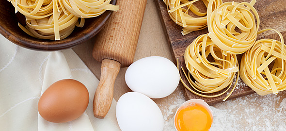 Πώς: Σε ένα μεγάλο μίξερ αναμείξτε 400γρ. αλεύρι για όλες τις χρήσεις, 4 αυγά, μία τσιμπιά αλάτι και 1 κ.γ. ελαιόλαδο, έτσι ώστε να γίνει μία ζύμη (υλικά για 4 μερίδες).
