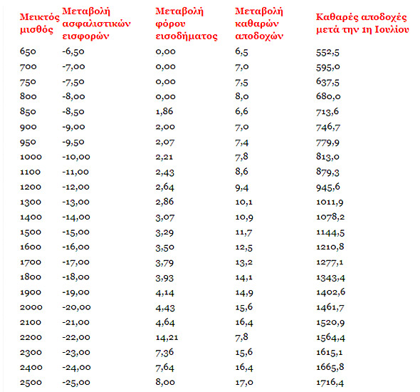 Ας δούμε τον αναλυτικό πίνακα που ακολουθεί από τον οποίο προκύπτουν οι μεταβολές σε όλους τους μισθούς από τα επίπεδα των 650 ευρώ έως το επίπεδο των 2500 ευρώ.